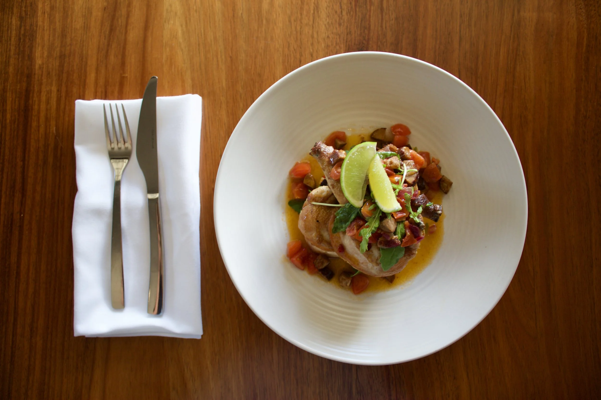 On a bed of preserved lemon dressed rocket with garlic aioli
